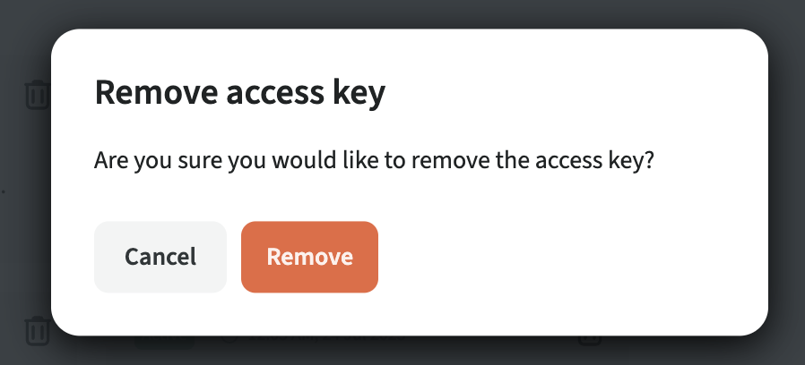 Each bar has a Remove button. The Remove access key window opens after clicking on the button. If you click on Confirm, the key is removed from Your keys bars. If you choose Cancel, the key remains in the list.