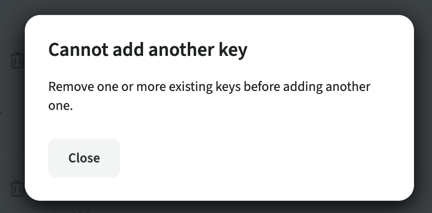 When you have 10 access keys (active and/or expired) and click on the + Access key button, the following window opens: