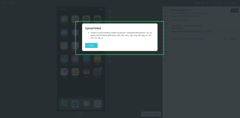 You can upload only the following file types: .plist, .doc, .docx, .jpg, .msg, .pdf, .png, .txt, .xls, .xlsx, .csv, .log, .js