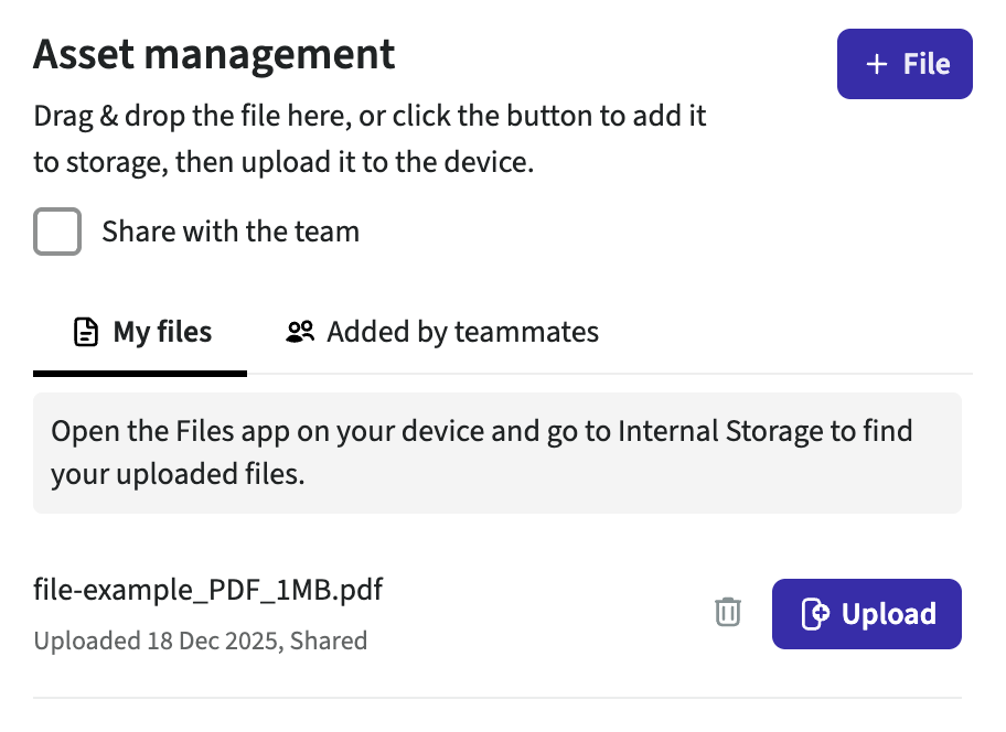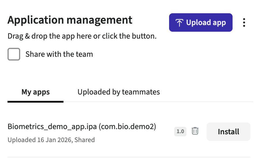 Upload your .apk or .ipa files to the tab to install them on the Mobitru devices.