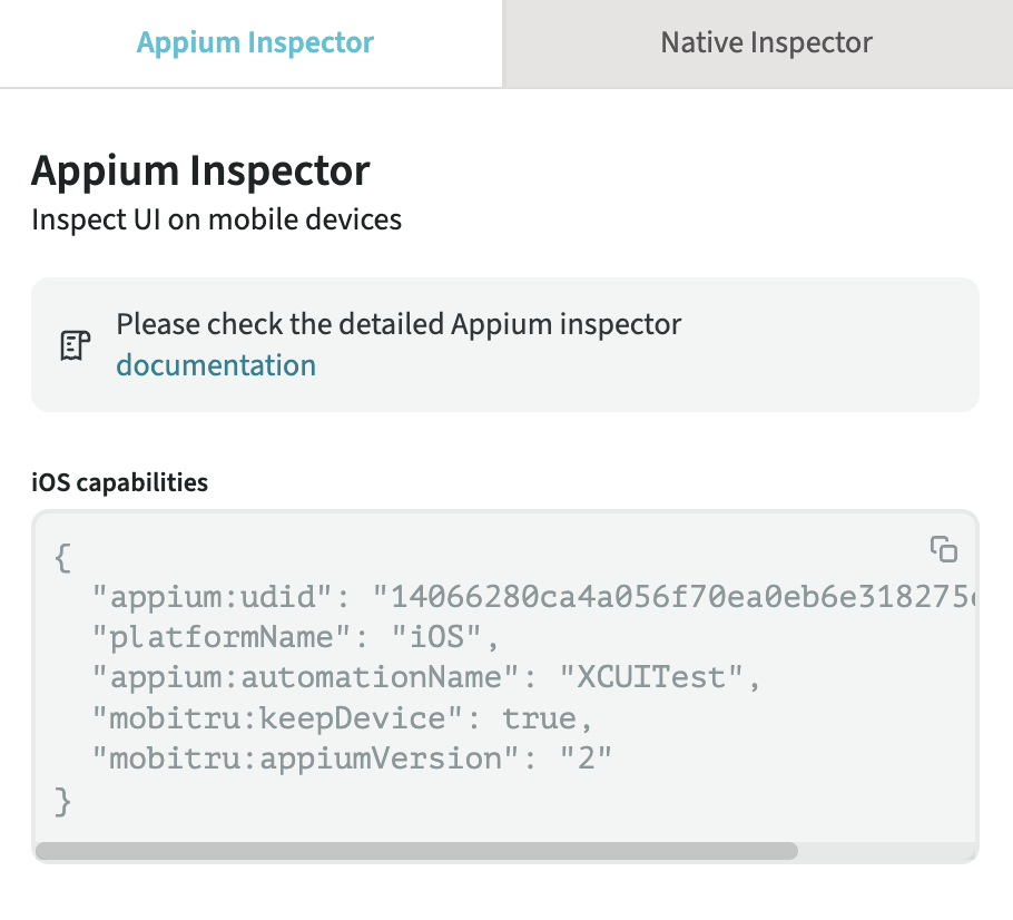 Find the desired capabilities in the Appium Inspector tab. They are required for Mobitru and Appium Inspector integration.