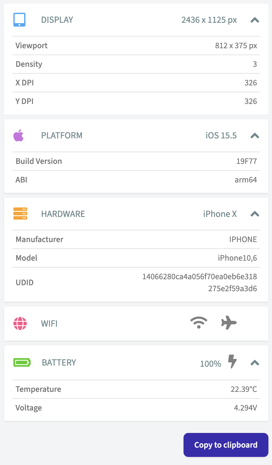 Check the display, platform, hardware, wifi, and battery information about the device in use. Copy this information to your computer.