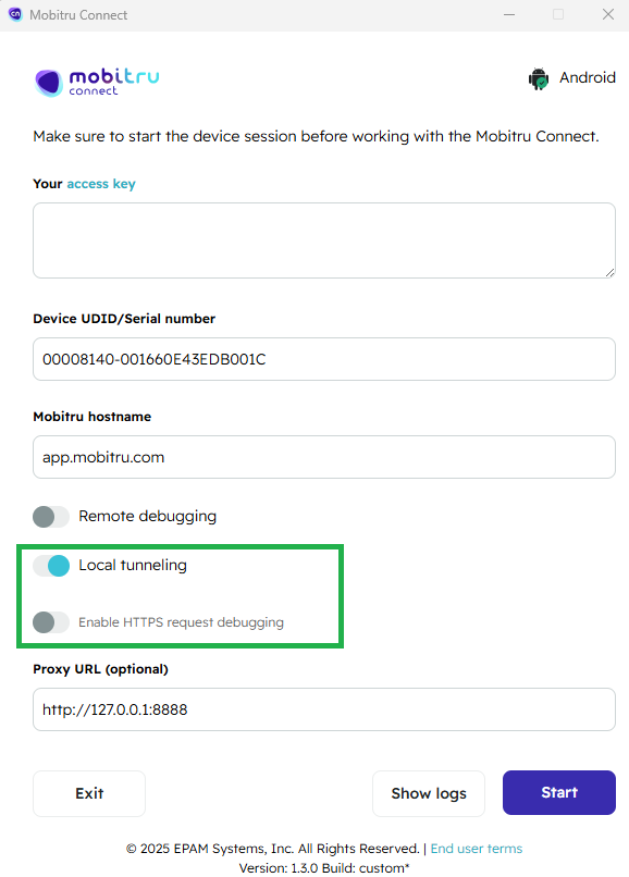 3. Connect to your device using Local Tunneling.