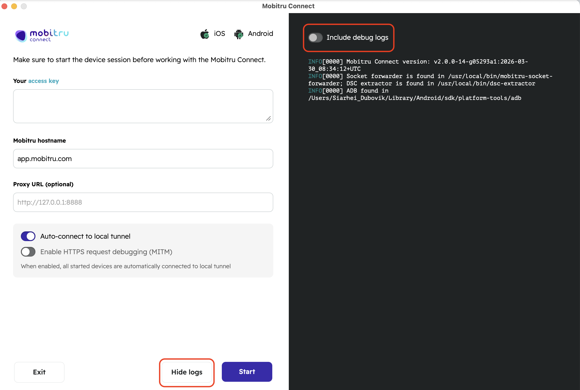 If an issue happens in the tool, before contacting support@mobitru.com, collect logs of the error: