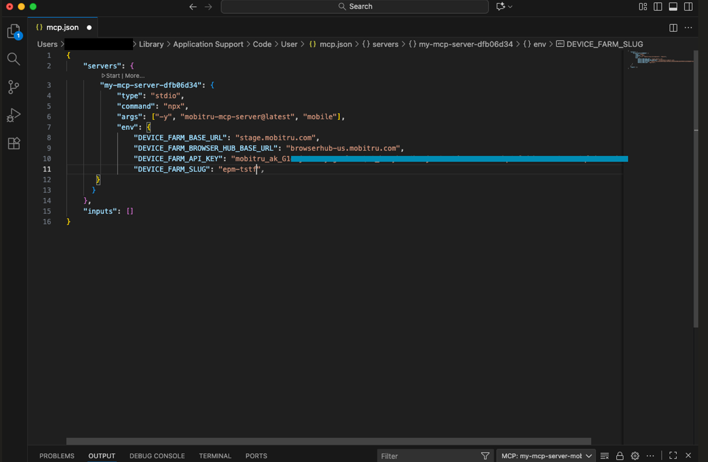 }![]() | Notes: DEVICE_FARM_SLUG – your billing unit name DEVICE_FARM_API_KEY – your API key args: [“-y”, “mobitru-mcp-server@latest”, “mobile”] – for mobile MCP server args: [“-y”, “mobitru-mcp-server@latest”, “playwright”] – for cross-browser MCP server |